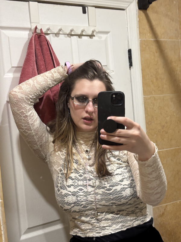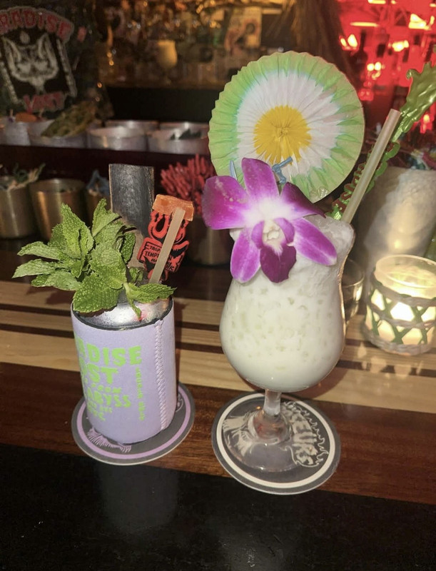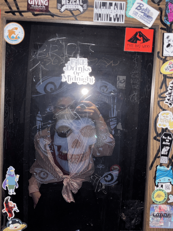 After big greedy chopped cheeses we went to Paradise Lost and got big greedy cocktails. I chose the drink I got because I wanted the novelty koozie it came with however it ended up being strong as HELL. And it was marked on the menu as the LOWEST STRENGTH so I'm somewhat terrified to ever go back and try another drink... However I am really intrigued by their cocktail that has pig blood in it. Especially because I'm pretty sure it also had apple gin in it which was my absolute favorite discovery when I studied abroad in England back in 2022 and haven't had since then so. Maybe someday. Anyways the other picture is a mirror selfie I took in the bathroom to show off the haunted mirror. They were playing like an audiobook of the Bible or something in the bathroom which was extremely soothing. We really liked the aesthetic of this place. Campy haunted tiki bar! Felt like a vampire on vacation. Apparently my big autistic-eyed stare was really off putting because the bartender asked me not once but TWICE if I was okay with a lot of concern in her voice because I guess I was staring unblinkingly at her #oops