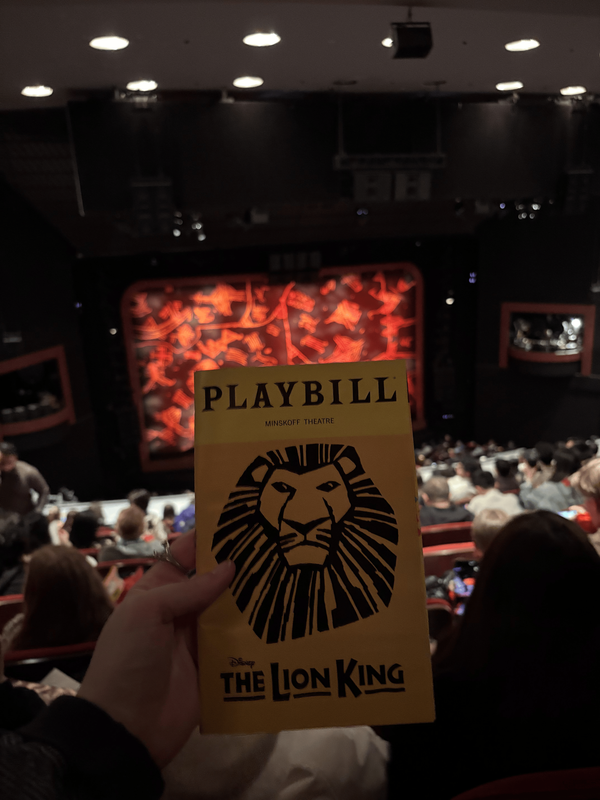 Harvey has wanted to take me to see the Lion King musical for years now because of my puppet special interest. Watching all the beautiful puppets fill the stage as everyone sang so loudly and beautifully and the orchestra swelled and the sun started rising during the opening number, I actually felt tears welling in my eyes which really embarrassed me until intermission when Harvey told me they almost started crying during the opening number and I felt like I could admit to them that the same thing happened to me. It was just so beautiful! Unfortunately what was not so beautiful were the voices of all the Disney adults sitting in the row behind us who were quoting the lines and singing along to all the songs. FULL GROWN adults btw. It was really distracting and annoying so I did ask an usher during intermission if we could move and she actually found seats for us that were even closer so that was pretty awesome. I didn't know what to expect but the Lion King was honestly really cool. Not sure why the actor who played Timone was painted a distracting shade of bright green that just made him stand out more than even the puppet but... whatever. Timone and Pumba are the worst part of the movie so it's no surprise they're the worst part of the play too.